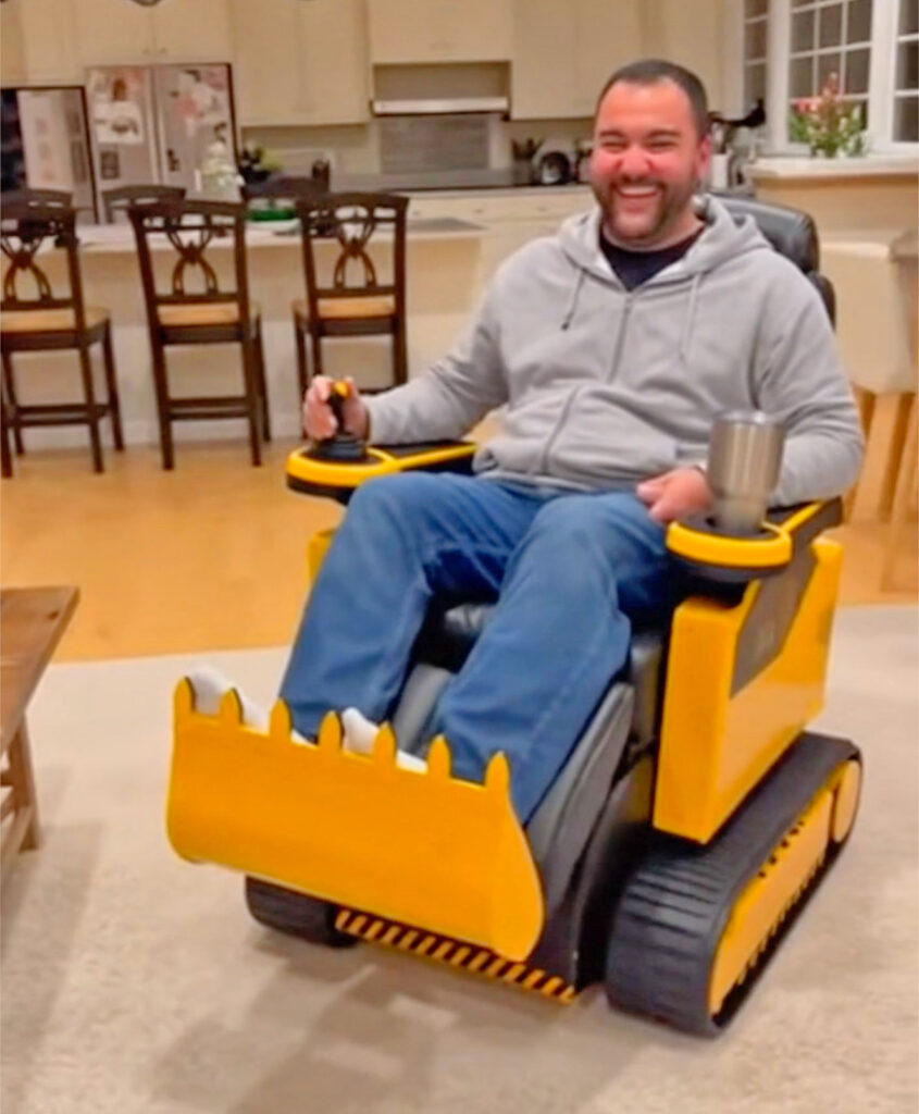- Excavator style: Track base, bucket-shaped footrest that tilts up and down, full machine aesthetic.