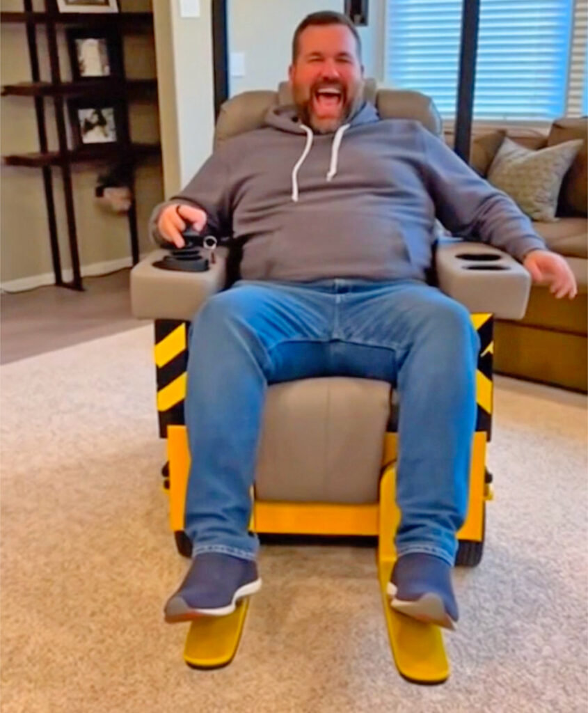 A heavy equipment recliner is a full-sized electric lounge chair styled after machinery like forklifts, bulldozers, and excavators. Key extras include powered wheels or tracks, dual joystick controls, and built-in fun features like lights, backup beepers, and horns.