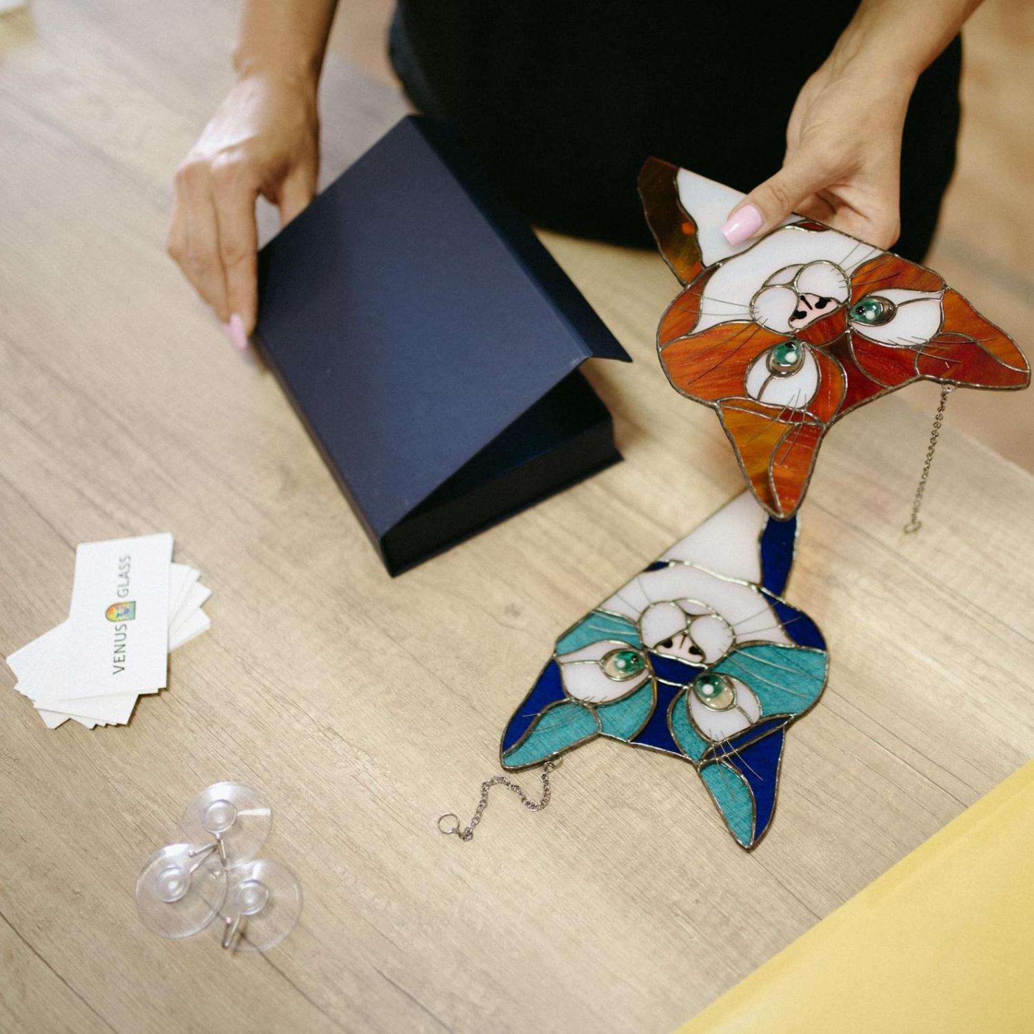 The Cat Suncatcher has been produced with high-quality US Spectrum Glass, copper foil, patina, and big, big love. The technique we utilize is called “soft soldering” also known as the “Louise Tiffany Method”. Cat eyes have been made with fused glass and look as real! This approach has been used for centuries by stained glass artists all over the world, specifically for decorating cathedrals, chateaus, and mansions.
